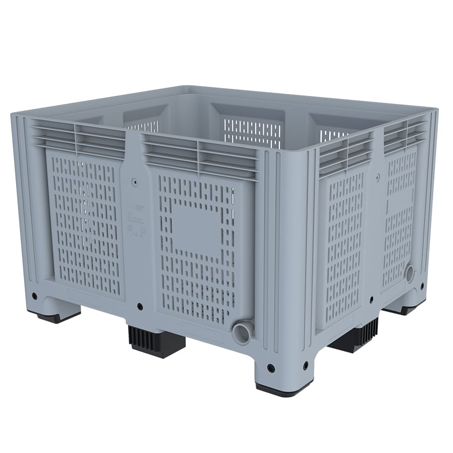 | Properties | Perforated walls, Closed bottom base, Anti-slip corners, 9 Legs, 4-way entry, Forklift / Hand-jack compatible, Stackable, One shot |